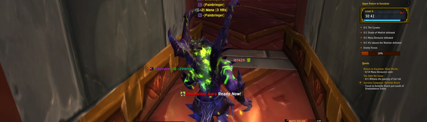 As I wrote about in my last weekly update, I decided to unlock my dungeon challenge tint by soloing Legion normals, and succeeded, and then also succeeded at soloing heroics just for a laugh, and decided – “what the hell?” and went for Mythic +4 Keystone, which happened to be Upper Return to Karazhan.