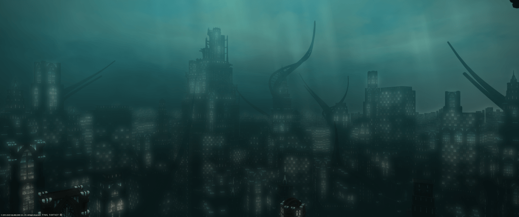 My absolute favorite MMO zone at the moment is FFXIV’s The Tempest. The zone name is kept hidden on the Norvrandt world map for all of Shadowbringers, and it is not until the MSQ begins winding rapidly to its conclusion that the game even hints at the zone, so if you haven’t looked at the full Norvrandt map (which the game doesn’t give you reason to anyways), you can be genuinely surprised by it. When you get to the point that the story pivots there, the zone fires you rapidly through its many wonders – a sea floor exposed, then the magically projected city of Amaurot that lies there for Emet-Selch, his own loving recreation of his homeland and a reminder of what he fights for. The music is calm, serene, and beautiful. Perhaps Bioshock’s art-deco touches have lingered with me for 13 years (also, did you know Bioshock 1 is 13 years old? Yikes) but Amaurot’s open-world version captures my imagination so well that when I have nothing else to do in game and want to simply unwind, I hang out here with the music on, vibing (as the kids say).