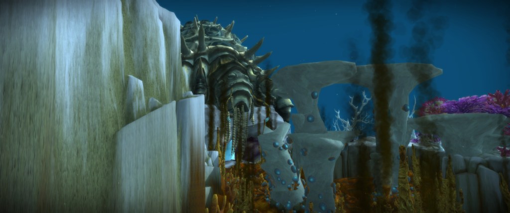 WoW is loaded with zones that have amazing vistas and serene landscapes as well. Much of Wrath of the Lich King has a sort of savage beauty, a realistic, wind and snow-swept landscape that fits the theme of the expansion perfectly. Vashj’ir in Cataclysm, for all of its faults, is an unsettlingly pretty zone that uses bright colors in contrast with deep dark waters as you push deeper into the zone. Pandaria is a wonderful land full of visual delights, from the obvious Chinese and Japanese architectural inspirations through to the biodiversity of the landscapes. Warlords of Draenor, for all of its faults, has some stellar zones visually, with my personal favorites being the snowcovered Frostfire Ridge and the brambly wilds of Gorgrond.
