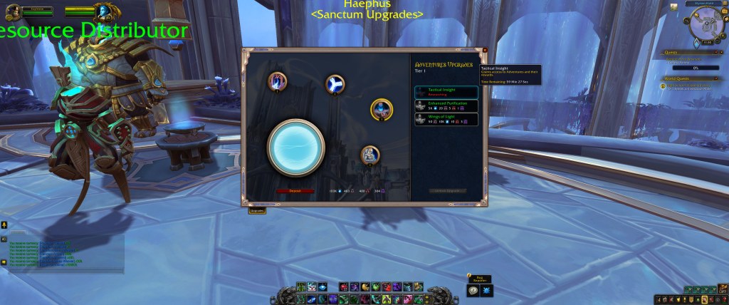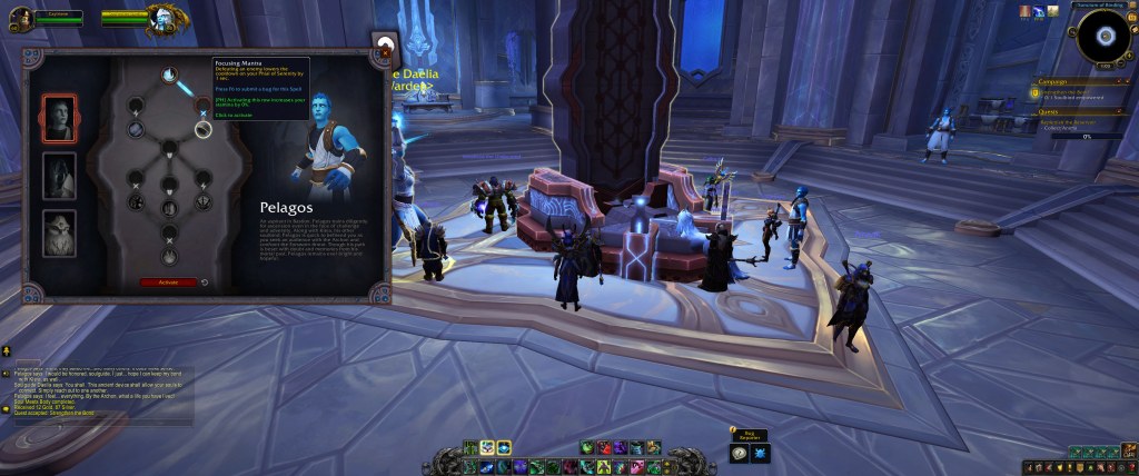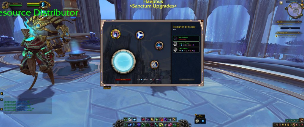 With each small circle, you have multiple ranks of upgrades, all which add things to your sanctum. Some are straightforward – a teleportation nexus gives you teleports around the zone, with each rank having more teleports. Some are less so, like the Path of Ascension, which is a minigame for the Kyrian. Resevoir Anima comes from select world quests, as far as I can tell, and while the rate of acquisition on beta is fairly anemic, since it just functions for sanctum upgrades and Soulbind resets, it isn’t too bad. Once the costs are tuned, I might have some concerns!