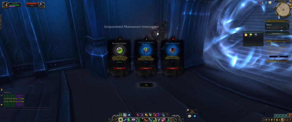 Torghast has a multitude of wings (9, by my glance at the foyer map), and as you run through the wing you’ve chosen, you do expected stuff – kill enemies, loot them, and progress through as things grow more and more difficult. However, the twists are in what Torghast does differently – firstly, it is randomly laid out. Each floor is different each time, giving you a new experience. Secondly, the zone offers Anima Powers, which you loot in the zone and can also buy from Broker NPCs that appear every few floors, which also allow you to repair. It also offers a lot of differences to standard WoW gameplay. For one, you can break pots! 10/10, best expansion of all time. Additionally, the environment is a danger. At one point, I walked through a bottleneck hallway, heard a click, kept going, and had a giant swinging ceiling axe take 50% of my health.
