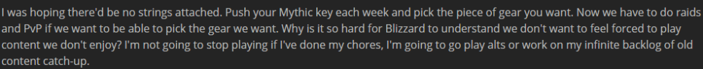 This system actually delights me with how much it opens the weekly cache. For many raiders I know, Mythic Plus felt like a must-complete activity to get a cache in early weeks, given the power it conferred, and that also felt weirdly exclusionary in a way, as Mythic Plus allowed players onto a gear treadmill that gave more rewards on average than raiding does anyways. By expanding it, a lot of my guildies will now have access to as many as 6 options for gear (curiously, the exact number they said at Blizzcon 2019!), someone like me who doesn’t really get super into key-pushing will get a weekly vault with up to 3 options, PvPers get currency for purchasing rewards and up to 3 vault choices, and someone sampling broadly across the content structure of the game could get up to 9. To address the Wowhead commentator whose comment I’ve used as a punchline, I think this system does the opposite of force unwanted activity – the current system forces raiders and PvPers to do dungeons they may not want to do. Under this system, you can get a useful piece of gear every week for whatever mode of hardcore endgame gameplay you do.