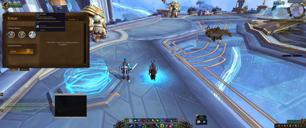 Callings Are Implemented: As I had suspected, callings seem to replace the world quest emissary system in a way that offers more variety to gameplay. When I logged on with my level 60 Demon Hunter I’ve been playing in beta for two weeks now, she had 3 callings available to do – one to do 4 world quests in Bastion with an aspirant at my side, one to do either of the Maldraxxus dungeons or an elite world quest – my choice, and one to free 15 souls from The Maw. Unlike emissary quests, however, I had to go find these and accept them in the world. All 3 NPCs were in my Covenant Sanctum, easy enough to find, although the UI needs some improvement to make that work well (my bug report to Blizzard in-game said as much). Once you have the quests, you go out and complete the objectives. The first calling was the most traditional, as the aspirant offers negligible DPS (and for one of the world quests, he couldn’t help anyways since it was a minigame-style), so you just pick 4 world quests and go get to it. With 5 options up, this was a bit dicey, but it worked – I had 4 regular ones (and not the fucking Flappy Bird minigame, thank god!) and a pet battle, so I did the 4 regular ones, ran back to Elysian Hold, and got a cache. Inside was an anima token and a piece of vendor trash worth 414 gold (I get the impression these are very much in-development).