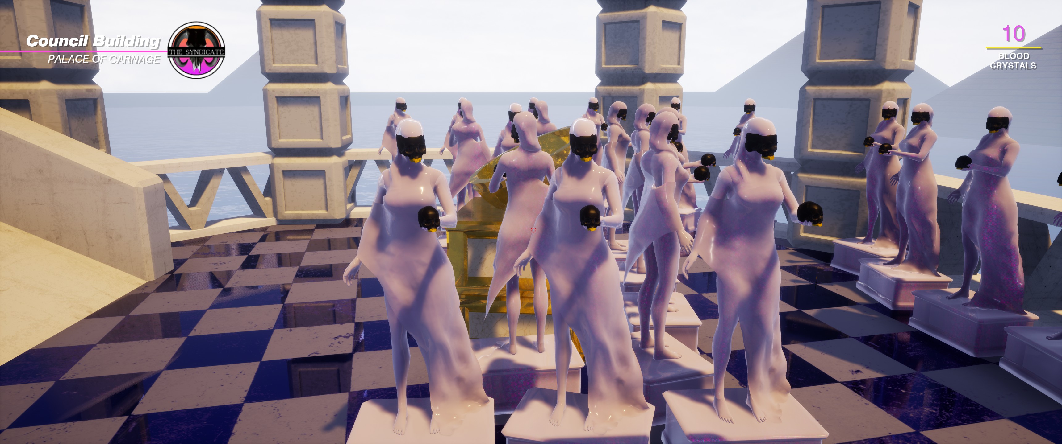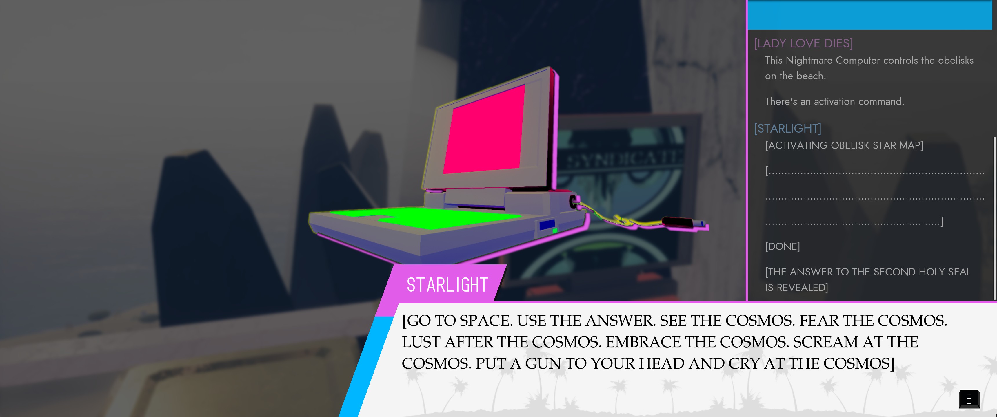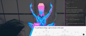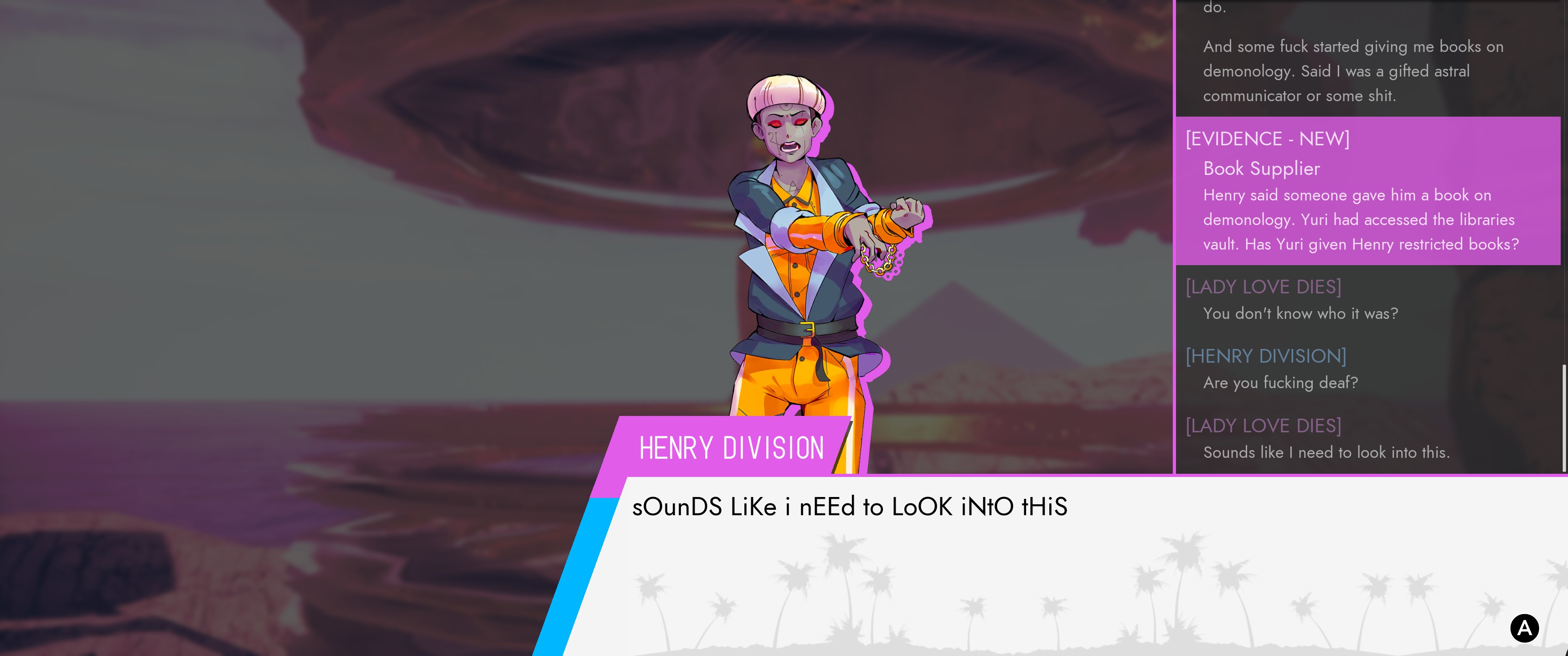 First, the positives – Paradise Killer is an extremely open game that allows players to approach the game from all kinds of different angles. The core premise is simple enough – you are Lady Love Dies, the investigator of the Syndicate that runs the Island Sequences. The Island Sequences are an alternate reality tied to the real world, run by the immortal Syndicate members. Each island is an attempt to curry favor with the Gods of the world, which the Syndicate does by…kidnapping and enslaving people from the real world to serve as Citizens, who perform the work that makes the island live and thrive. Each island continues until demon infestation occurs, at which point the Architect of the Syndicate designs the next island, which the Syndicate moves to, while the Citizens are sacrificed in a blood ritual and the power of their deaths used to move the Syndicate to the next sequence.