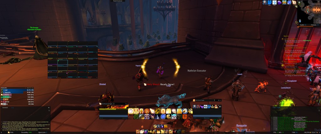 Our guild is pretty casual – short of a few tryhards and a few godawful meter maids who often die to dumb things trying to pad their numbers, everyone came as they were. In a Legion or BfA design paradigm, this would have been fine – item levels would have been in a narrower band of power, and we’d be able to progress a bit better. In the Shadowlands paradigm, however, our raid had a 33 item level delta from top to bottom, and we had a distribution among our 30 players that was split into even thirds – one-third in the 180s who had been running Mythic dungeons a lot, one-third in a mid-170s area who had done Heroics and maybe a few Mythics or bought some BoEs (this is where I was, btw), and then a third of the raid down in a low 150 range – people who’d gotten so used to the old design that they hadn’t really run dungeons, bought BoEs, or anything – they basically came in with quest gear, covenant armor pieces, and world quest stuff, plus maybe a few drops from Normal dungeons, and that was it. So our DPS was extremely lacking, and a lot of checks that we encountered were insurmountable for it. Our Artificer Xy’mox kill, for example, was a messy affair that pushed over the finish line nearly 5 full minutes over the average kill on Warcraft Logs!
