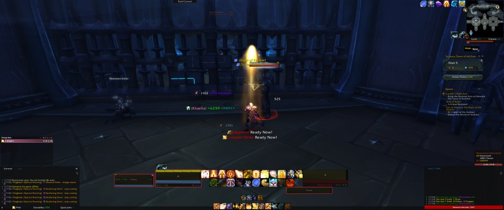 With anima powers, more is better, and you’ll want to figure out how best to prioritize your pickups based on your playstyle. Generally, it is a safe recommendation to go with powers that accentuate your weakness as a class and spec – on my Holy Paladin I take damage buffs, on a tank I would likely do the same, and on a DPS, I would emphasize survival generally – but these tend to only be true at the start of a run. Once you’re 10+ powers deep, you have a lot more flexibility to extend past your weak spots into building strength – for example, there’s a common power for Paladins that increases Hammer of Wrath damage by 30%, which is fine, but not necessarily special. Well, you can later get powers that increase it to a 4-charge ability, a power that makes it sometimes usable at any target health after casting Judgment on an enemy, and then on top of that, Avenging Wrath lets you use it at any time outside of execute range. The 30% buff on its own is fairly unexciting, but once you start adding these other traits in, it becomes far, far better. This is what I’m thinking of when discussing synergy, and why most static recommendations based on a min-max modality fall flat in practice – based on the options you’re offered and what you take prior to a given power being offered, the net power of a trait can often be far different in the real world. In short – take what you want and what makes your play feel comfortable and safe, and look for synergistic powers that can maximize powers that are less potent on-paper.