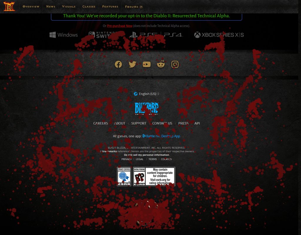 My personal take? As I said above, this is the Blizzard title with, bar none, the most nostalgia for me possible. While a lot of my readers and the bloggers I follow were very big into the WoW Classic phenomenon from launch onwards, Diablo II is the title with the most rose-colored glasses for me. I liked Diablo III overall, especially post-2.0, but a near-perfect remastering of Diablo II that I can play on my modern PC with modern tweaks and updates? Hell yes, I am all in on that. I signed up for the technical alpha immediately, and read the whole site, including clicking the old lobby jewel they put at the bottom and discovering you could make it sprout blood that you can paint the website with! (Makes the pending ESRB rating logo a little bit more interesting, certainly.)