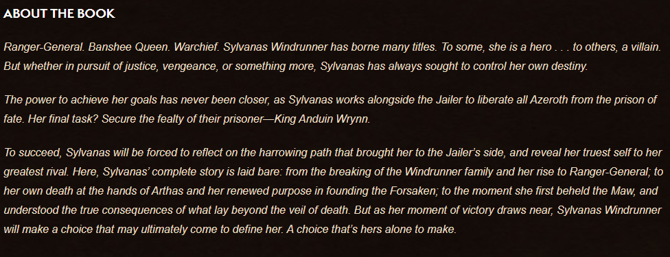 But to the topic of the future, here’s where I get worried. The WoW team has confirmed a new novel launching in November – simply titled “Sylvanas.”