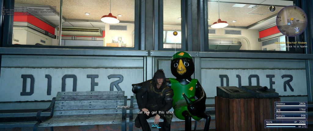 What I found actually really compelling about the game as a whole is the gameplay integration of that central theme of friendship, or as I came to jokingly call it, the “bro-adtrip.” In order to actually gain your XP from battle and quests, you have to call it a day by striking camp or checking into a lodging. The friends have specific combos and team attacks they use together, and each character has a personality that persists between story and gameplay. Each friend has a unique skill – Gladio levels up Survival from running in the open world, which allows him to scavenge items in battle, while Prompto levels up from taking photos, and offers side quests at designated points on the map to take special photos. Ignis levels up by cooking meals for the party at camp, while Noctis fishes for his skill. Each of these translate into all sorts of things – Gladio loves camping and will always push the party to camp with verbal cues when a campsite is nearby, while Ignis uses a scan ability in combat to reveal weaknesses and concocts recipes from food items picked up from animals fought in battle. Prompto shoots, both with a camera, and with his signature guns in battle. It’s a really cool theming device and one of the elements that I think was consistently well done throughout the game.