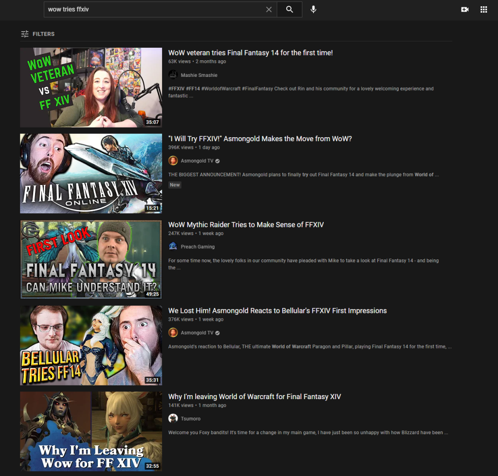 Anyways, let’s start this new week off a bit spicy, shall we? A lot…a lot… of prominent WoW content creators are trying out Final Fantasy XIV lately. This isn’t altogether a new trend – some of the big and prominent FFXIV creators were WoW players prior to FFXIV, like Zepla and MrHappy – but a lot of the names coming over now are shocking to some extent, because they are all names that are defined by their content creation centered on World of Warcraft. Bellular, Preach, Quazii, and, may God have mercy on all the FFXIV players, Asmongold, just to name a few of the ship-jumpers. To illustrate, I did a search on YouTube for “wow tries ffxiv” and here’s a quick taste of a very large and expansive set of videos: