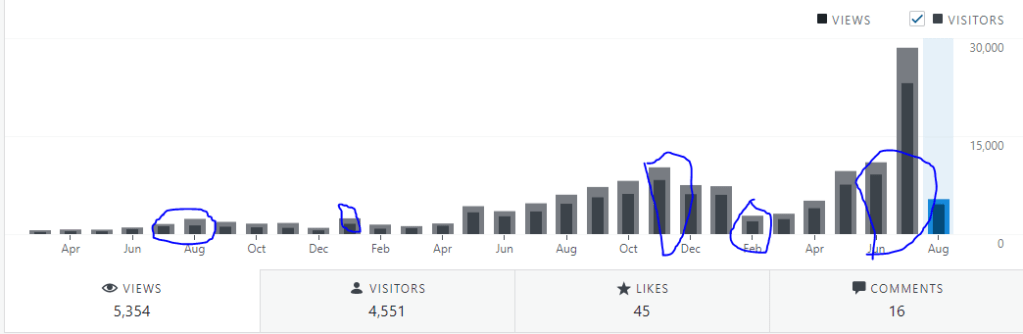 So following the monthly trend and analyzing what happened when helps keep me sane, because I like it when people enjoy my content and are happy to come back for more and it overcomes my urge to change my style or throw in different posts to the norm just because of dips if I can attribute the dip to something meaningful and convince myself to stay the course. At the same time, you want to move up even higher in your viewpoint to see what the overall trend is – if you have a bad month and it gets to you, you just need to see that the needle is moving higher on a yearly basis: