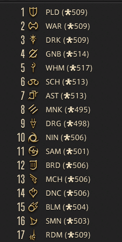 This one is mostly done! There’s a little bit still left to do, a couple of jobs still lagging, but I’m right on the cusp for the most part and with the remaining resets, I should make it just fine. Here’s my combat job gear levels:
