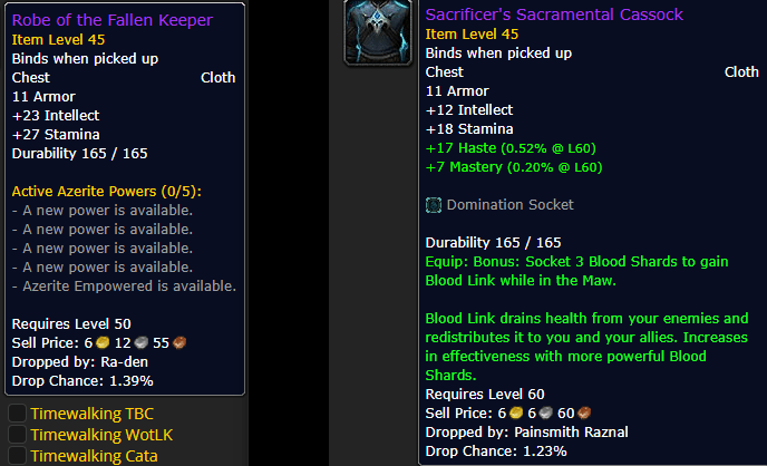 If Azerite works in the TWMT, then there will be a tradeoff to make here, as wearing 3 Shards will mean foregoing at least one piece of Azerite armor, and vice-versa for wearing 3 pieces of Azerite armor. In my opinion, Azerite traits generally offer slightly better overall improvement, and if they work in the TWMT, my suggestion would be to take 3 Azerite pieces and two DPS Shards. Of course, if Azerite traits are disabled in Timewalking with the patch, then this is moot, wear your 3 best Shards in whatever armor slots work favorably for you!