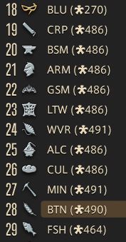 Crafting and Gathering are best in the high 400s because the Aesthete’s set is better than the scrip set, and the item level of even the scrip set is pretty low, so those jobs are fine where they are. On the combat side, I did get most jobs right around 510. I have a few outliers around 505 and my main play jobs of present (White Mage and Gunbreaker) are both near 520, so I feel good about the progress here. I have a stockpile of Eulmoran Certificates of Import to flip for Augmented Exarchic gear when the Crystalline Rain goes on sale for Poetics instead of Allegory, so on Friday I expect that I can push my low jobs to the 510 mark anyways!