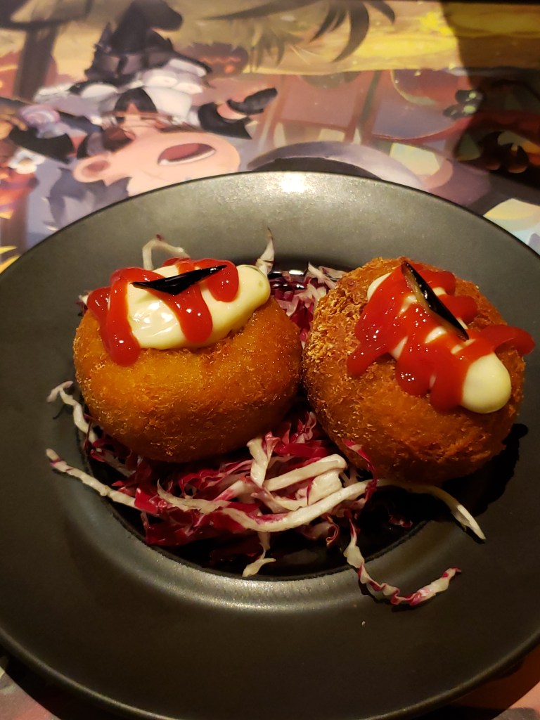 This was a menchi katsu (a ground, fried pork cutlet with breading) and it was very good. One of the few items where the decorative element to bring FFXIV to the food wasn’t a manufactured or non-edible thing, as they put the sauce on the menchi katsu in the pattern of the eyes! It’s definitely the dish I remember the most, although probably not as good overall as the Raubahn rice stew (it was so good!).