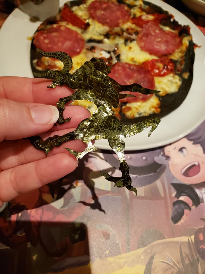 It’s got King Thordan in a blue-dyed fish broth served cold. Cold noodles are a thing in Japan, but texturally, it wasn’t for us (I don’t like a lot of fish broth in the first place so my wife got it and she didn’t like the cold in general or the texture it conferred on the noodles). Looks cool though, and I believe I got my Alexander coaster from it, so 4/10!