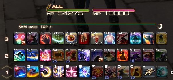FFXIV PvP is fun, generally. The way each job brings a unique feel to the table and can be powerful in different ways is something that feels very different as expressed in PvP compared to the normal PvE focus of the game. In PvE, Samurai is a burst machine, concentrating a ton of their damage into two-minute burst windows with multi-hits of Midare Setsugekka, Shoha, Hissatsu Senei, and Ogi-Namikiri, coupled with a refreshed Higanbana DoT that ticks away for damage on the target, and then a smaller 1-minute burst window in-between where you have no Ogi-Namikiri or Senei but can still cram a reasonably large number of heavy hits in. In PvP, you kind of don’t have that – you have to create a much different burst setup around skirmishing, picking a single target to unleash on with a mix of your main single-target combo, Midare, and building towards a Shoha, which comes much faster in PvP. Here are my hotbars for each, to compare the relative complexity of the PvE and PvP kits: