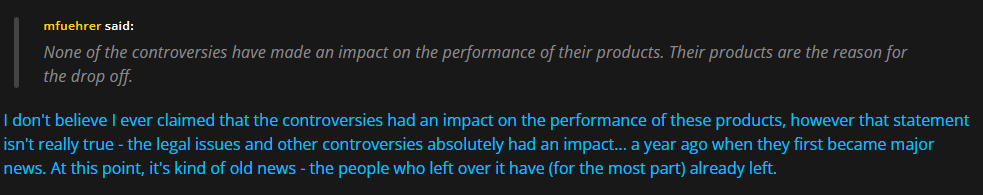 1. I agree. There will be those prominent people with streams that will come back under the guise that they are to support the employees that are still there. They will continue to condemn the company for past actions and lack of progress in change, but ultimately they will return.