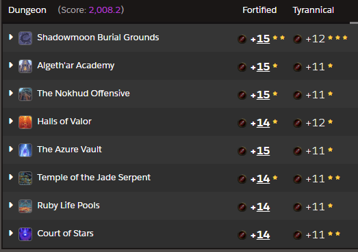 So if you haven’t read Raider.io before, here’s the easy rundown – the numbers without stars means I failed the timer, but cleared fast enough for rating still, and the number of stars corresponded to x-chesting a run, where one chest is just meeting the timer, two is beating it by 20%, and 3 is beating it by 40% of the timer amount. I only timed 3 +15 runs (albeit a two chest run in Shadowmoon Burial Grounds that pushed me over the finish line with some folks who brought me and a healer who were on the cusp of KSM purposefully to get it done), and while I timed some 14s and failed a 15 Azure Vault just close enough to get rating, you’ll notice my Fortified results aren’t that high, and my Tyrannical week was not very high at all, albeit with some 2 and 3-chest runs and a floor of +11 keys to set a solid foundation. With that context provided and the contrast of Shadowlands Season 2, you can see that the rating requirement, while still high enough to require some level of skillful play, isn’t a daunting height to reach if you enjoy playing Mythic Plus.