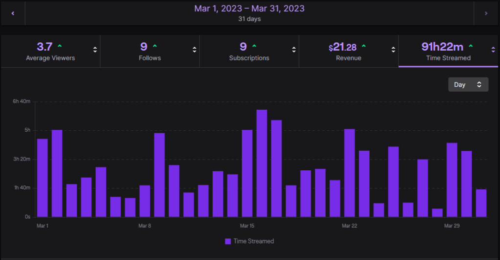 By the end of March, I had gained about 20% more followers, my second biggest follower count jump after my affiliate drive in the fall, increased my average viewership by 33%, and had higher peak viewer concurrency than any other time before. I had more subscription revenue for the month by a factor of like 3x, and I think it helped the soft skills part of streaming a lot – I was talking with more focus, less droning explanations, and was learning when I could lay out. I played games with text box dialogue I had to read and did voice changes for most (I wouldn’t say they were good voices, but I tried), and the overall results were very positive.