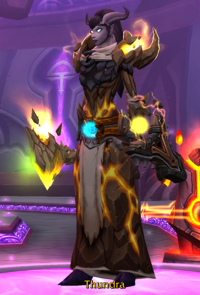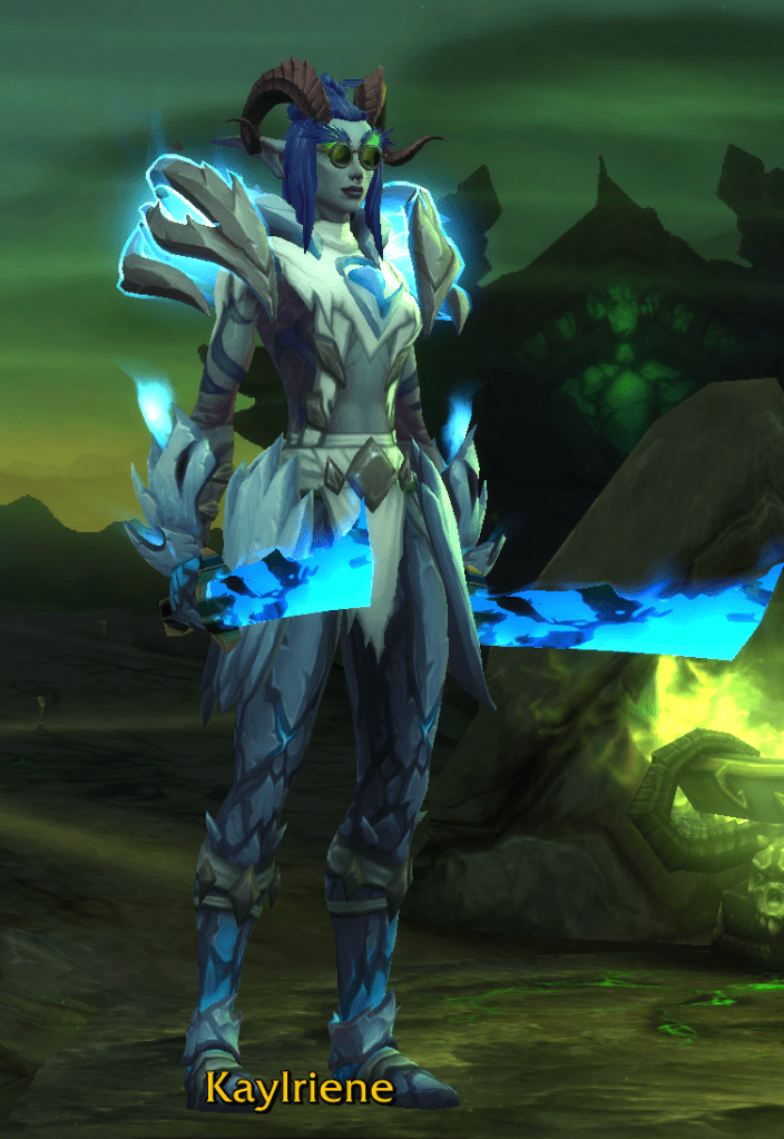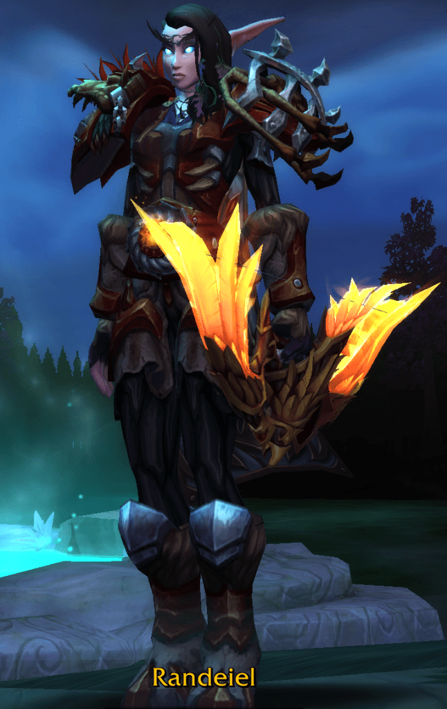 My second Warlock (the original is still stuck at level 50 post-scaling!), I leveled this character for Void Elf heritage armor back in late Legion and I enjoy playing Warlock more as Void Elf for the racial bonuses and the DPS contribution (my old lock is Worgen). I’m playing Demonology because the spec is the one I enjoy the most (maybe Affliction as runner up but it is doo doo in dungeons) and also because the Legion artifact for Demonology is the coolest one with the floating rune skull.