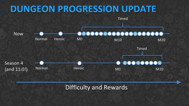 The biggest changes are, as expected in this kind of situation, to Mythic Plus. Mythic Plus is basically being scale-condensed, so a +2 of tomorrow will be the same relative difficulty as a current +11, with the rest of the scale basically continuing up past that so that a +5 is roughly similar to a +15 of today, and a +10 is the equal of a current +20.