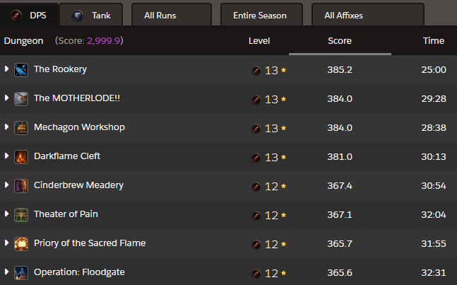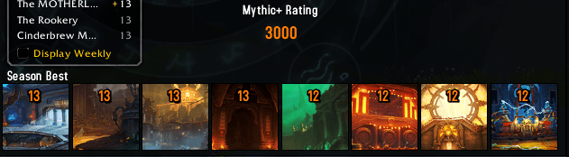 In a lot of cases where we completed the run but didn’t time it, DPS performance was just anemic, or we died too many times and incurred enough 15-second penalties to kill the timer where if we lived and otherwise played exactly the same, we would have won. A lot of the times, the tanks and healers were often the most toxic in those groups, and to an extent, I kind of get it – one super good Paladin tank I did a Cinderbrew Meadery +13 with was at 2998 rating (TWO points shy of Legend) and he did great, aggressive pulls, managed his own survival well, but in the end we failed the timer by barely a minute because of deaths (mostly DPS taking avoidable one-shots). He was mad at the end, because of course, had we timed it, he would be done with the KSL grind. Something similar happened in a Rookery +13 with a resto shaman healer and with a couple of the tanks in the Rookery +13s I strugglebussed through – some comments about how timing it would have been possible if only the other players had played a little better – higher DPS, better interrupts, etc. And the thing is that they weren’t wrong – a lot of the callouts those salty boys made were correct – but it wasn’t the best note to end on in those cases.