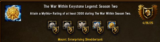 On Saturday night, April 26th, 2025, I did it – I obtained The War Within Season Two – Keystone Legend achievement. It was essentially a buzzer beater, as I hit 3,000 Mythic Score right on the nose, with Raider.IO saying my score is 2,999.9, which makes me glad that Blizzard’s own tabulation said “close enough” and rewarded the achievement!