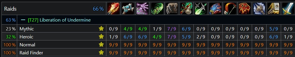 At this point, including Heroic and Mythic colorways, I have collected 63% of the total appearances of tier armor this season, including at least half of the higher tier difficulty sets for Priest, Warlock, Druid, Monk, and Paladin. At this point in totality, I have collected more TWW stuff as a percentage of the total available gear looks than I have for any other expansion, including Mists of Pandaria which was helped along massively by Remix. Granted, I have focused on that goal a lot more and been able to collect a lot more thanks to the alt army I raised in Season 1 of this expansion, but hey.