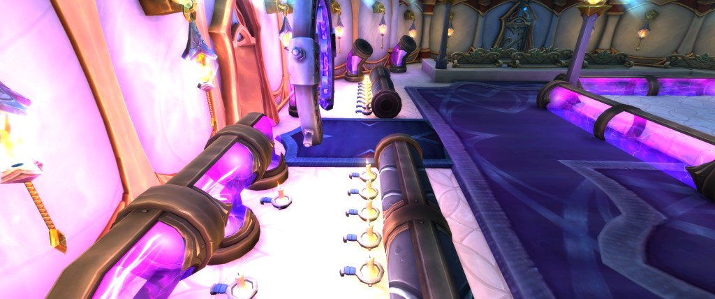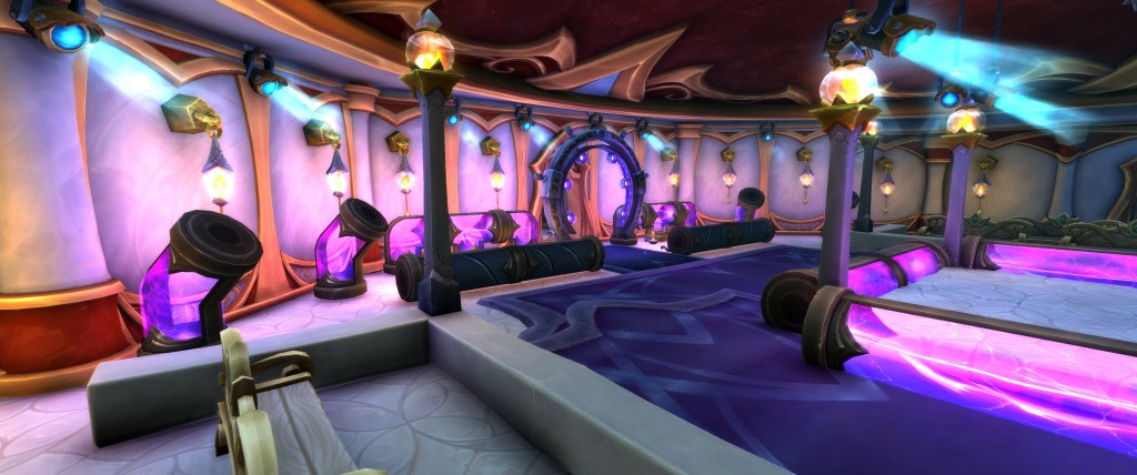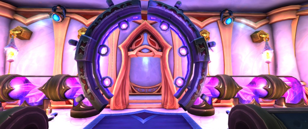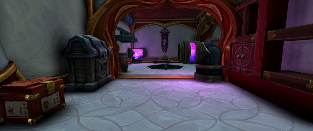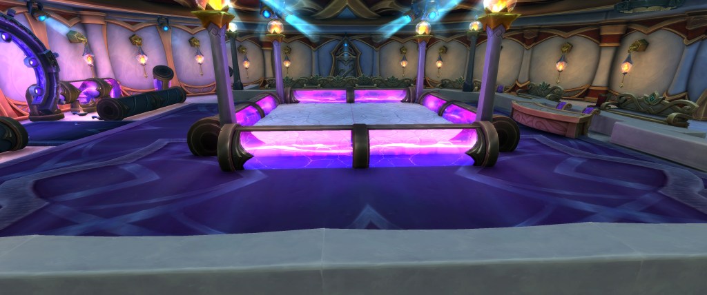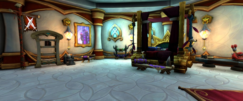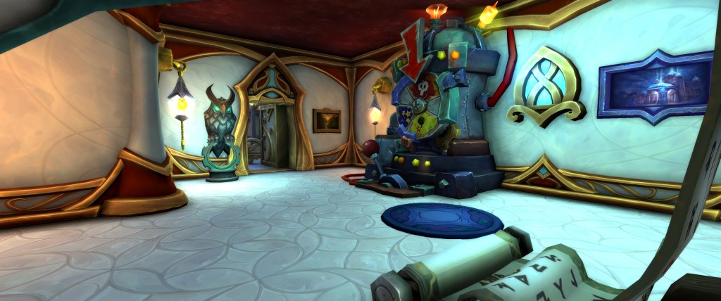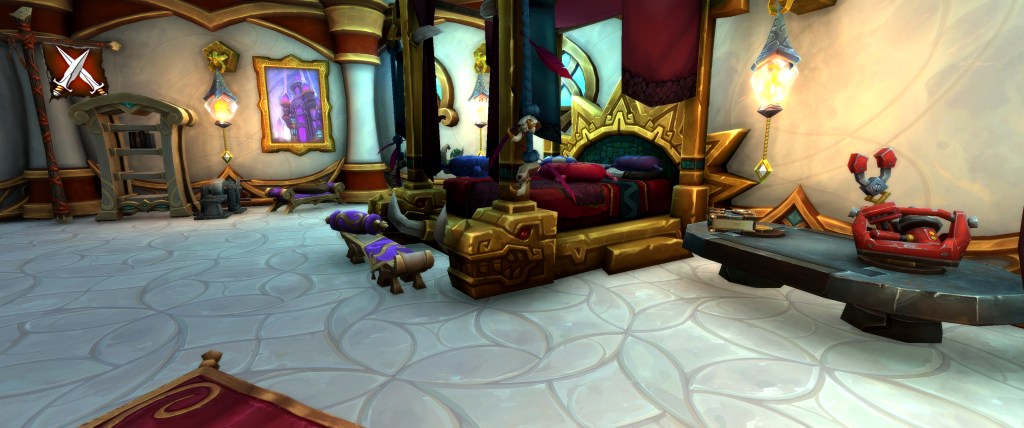 The hallway on the left of the arena leads to where the magic happens in the bedroom. This hallway has more crazy decor from all over Azeroth, including my achievement-reward slot machine from the Undermine raid which I wish was interactive!
