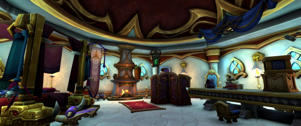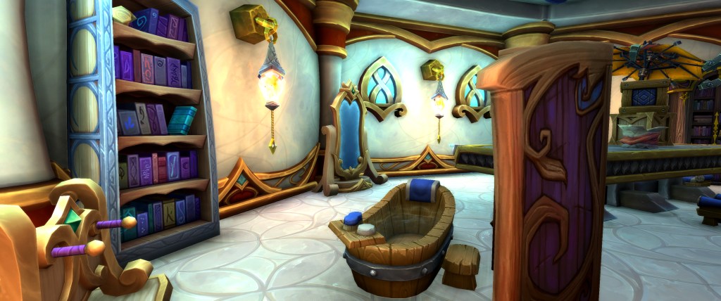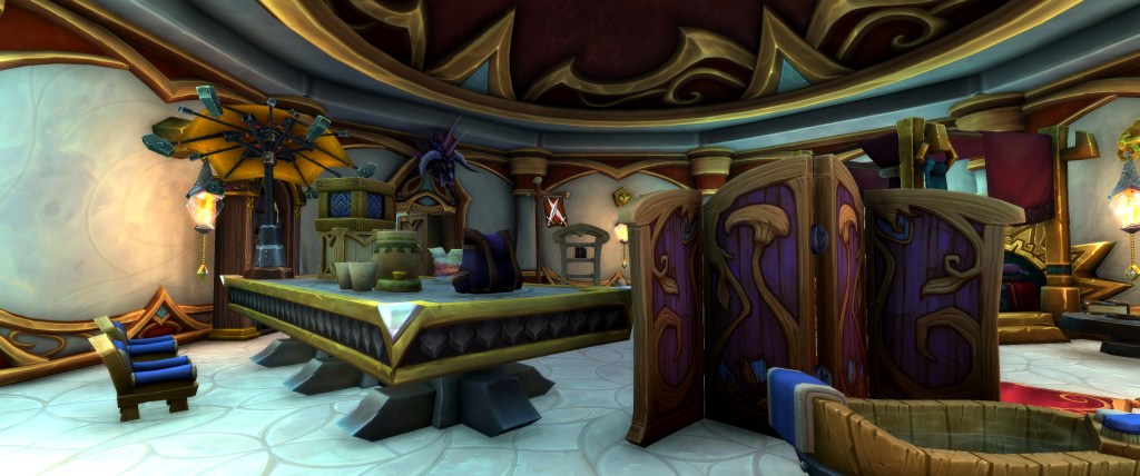 In the bedroom, we’ve got a fun table area with some leftover Undermine takeout (why not?), the spoils of more class halls (the Priest hall banner, the Illidari banner, and the trials of Odyn from the Warrior hall), a Zandalari bed with extra pillows (insert the Millhouse eyebrow GIF here), and of course, a little prep corner with a modesty barrier for a tub and mirror.