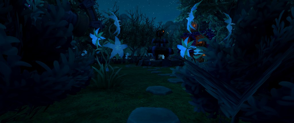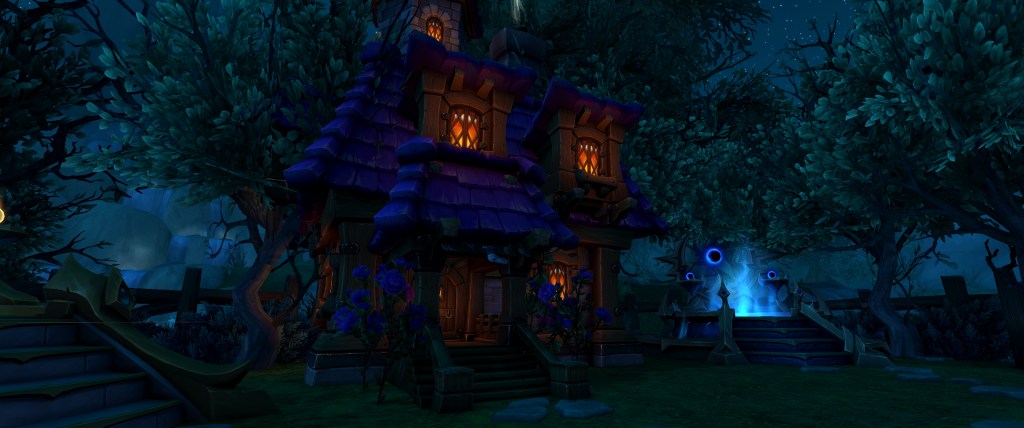 The front yard is made to blend into Brumewood, the area of the Alliance housing zone I am in (this is plot 0). I used an Undermine fountain, Duskwood trees and bushes, some basic stepping stones, a couple of different flower types, and the two wells from the Epic Edition preorder to fill out the space, along with moving my house to the rear edge of the plot. I used purple trim with the stone construction to give the house a dark and broody vibe similar to the neighborhood area as a whole, and used the trees in particular to block out my plot line so that it has a trapped in the forest feeling.