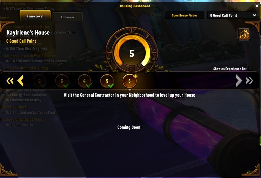 There’s another system related to Decor I am maybe a bit more neutral to negative on – house experience. Housing has a level based on completion of Endeavors and first-time acquisition of green or higher quality decor items, and leveling up your house gives you additional room types as well as additional indoor decor placement budget and room budget to make bigger houses. Right now, since Endeavors aren’t available, the only way to level up your house and reach those higher capacities is by acquiring as much decor as possible – it doesn’t take all of it, and by the time I hit up all the vendors I was already at level 5 (the current maximum) even without buying everything, but as a system it does add a little layer of that Blizzard gameplay-focus that feels a bit out of line with housing as a feature. WoW players love to follow a guide through an ordered list of tasks to accomplish something, so I’ve seen a fair few players get salty that they “have” to go to all these vendors and it’s like, actually you don’t, but I get why it feels bad to people and it is certainly cumbersome for now even if I see the vision and kind of like it. For what it’s worth, I enjoyed the jaunt down memory lane of going all over the world to seek out vendors and it was a bit of a fun, if brainless, activity to get my housing inventory stockpiled for the two plots I now own.